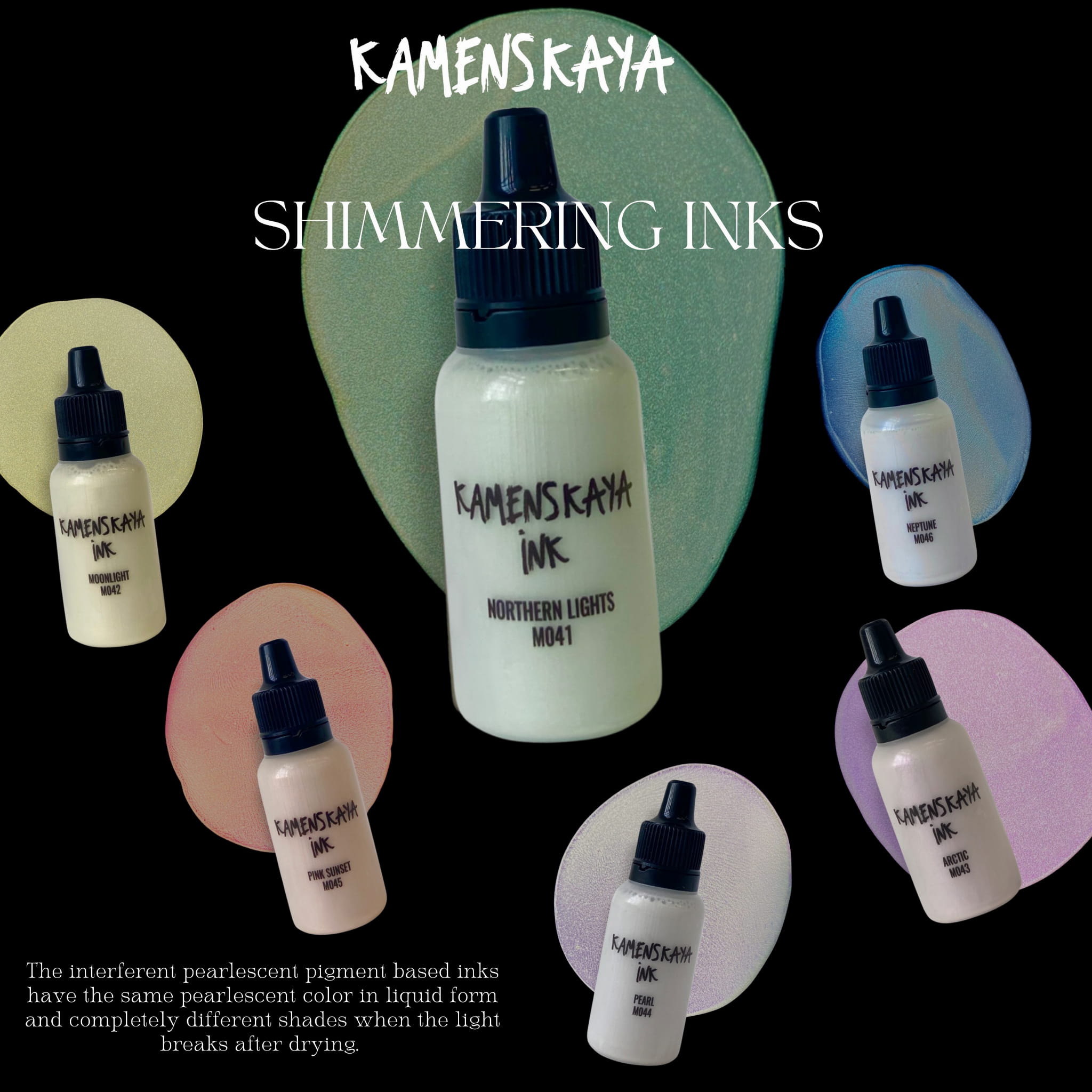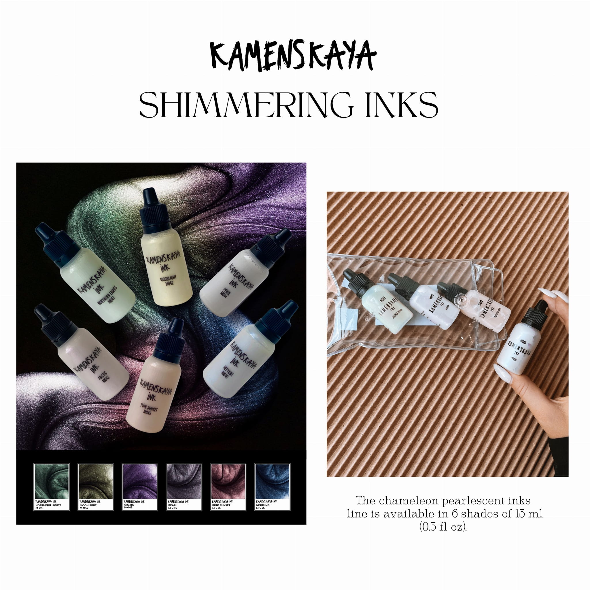 Na pierwszy rzut oka wyglądają jak masa perłowa, ale po wystawieniu na działanie słońca staje się promiennym, jasnym odcieniem, który magicznie mieni się w świetle. Wygląda idealnie na ciemnych powierzchniach i doskonale łączy się z innymi seriami tuszy, dodając blasku i świetlistości odcieniom.