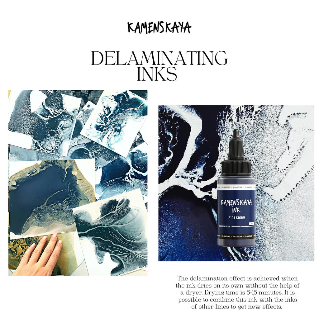 Zainspiruj się możliwościami, jakie oferują atramenty rozwarstwiające KAMENSKAYA, i eksperymentuj, łącząc je z innymi liniami atramentów alkoholowych marki.